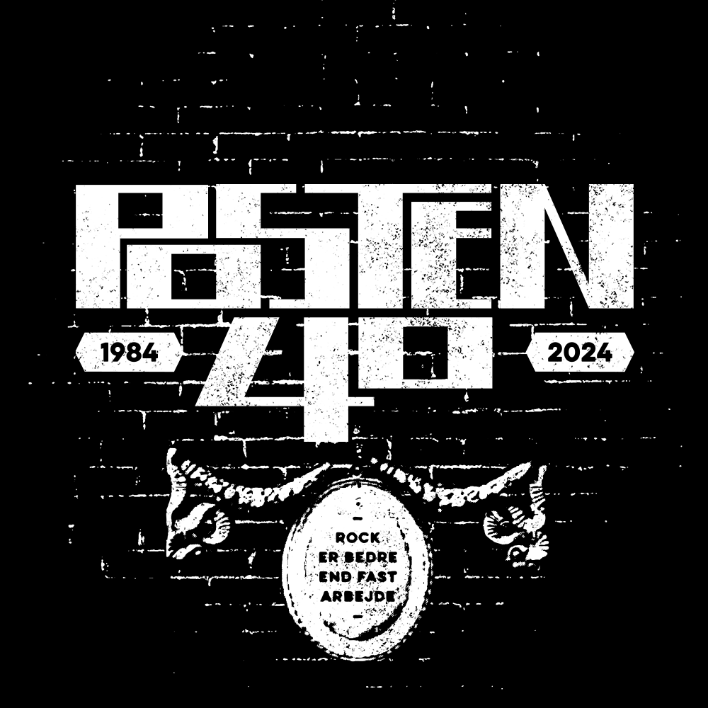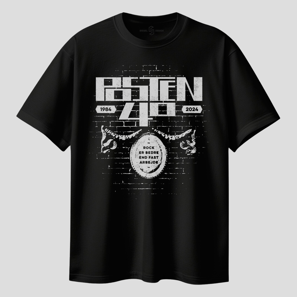 Sort unisex model med tryk på front. Posten 40 - 1984-2024 - Inkl. husets oprindelige slogan: Rock er bedre end fast arbejde.