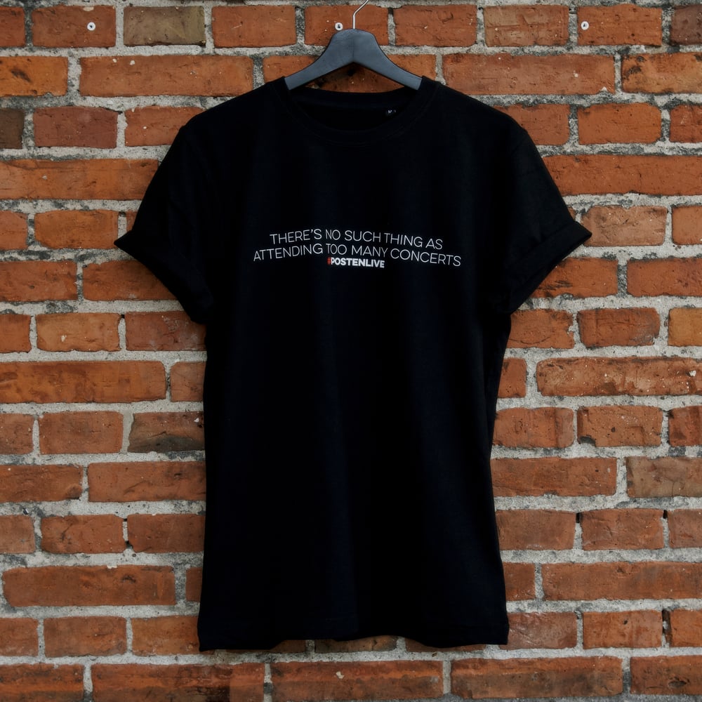 Posten logo på ryg samt Postens slogan: "There Is No Such Thing As Attending Too Many Concerts" på brystet.